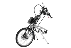 Vorspann-/Einhängefahrräder mit Handkurbelantrieb ermöglichen die selbstständige Überwindung größerer Wegstrecken in Verbindung mit einem vorhandenen Greifreifenrollstuhl. Mit einem entsprechend abgestimmten Kupplungsmechanismus werden sie mit dem verwendeten Rollstuhl zu einer Einheit verbunden. Der Kupplungsvorgang kann durch den Rollstuhlfahrer eigenständig durchgeführt werden. Bei angekuppeltem Vorspann-/ Einhängefahrrad werden die Lenkrollen des Rollstuhles um ca. 5 cm bis 10 cm angehoben und es entsteht ein dreirädriges Fahrzeug, welches mit Handkurbeln, die sich auf Brusthöhe der Versicherten oder des Versicherten befinden, angetrieben wird. Die Kraftübertragung auf das Antriebsrad erfolgt durch einen Zahnriemen oder eine gekapselte Kette.