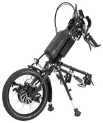 Vorspann-/Einhängefahrräder mit Handkurbelantrieb ermöglichen die selbstständige Überwindung größerer Wegstrecken in Verbindung mit einem vorhandenen Greifreifenrollstuhl. Mit einem entsprechend abgestimmten Kupplungsmechanismus werden sie mit dem verwendeten Rollstuhl zu einer Einheit verbunden. Der Kupplungsvorgang kann durch den Rollstuhlfahrer eigenständig durchgeführt werden. Bei angekuppeltem Vorspann-/ Einhängefahrrad werden die Lenkrollen des Rollstuhles um ca. 5 cm bis 10 cm angehoben und es entsteht ein dreirädriges Fahrzeug, welches mit Handkurbeln, die sich auf Brusthöhe der Versicherten oder des Versicherten befinden, angetrieben wird. Die Kraftübertragung auf das Antriebsrad erfolgt durch einen Zahnriemen oder eine gekapselte Kette.